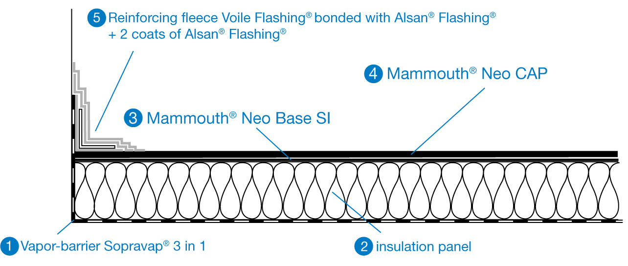 With the use of Alsan® Flashing® for upstands, Sopravap® 3 in 1 as a vapor barrier and Mammouth® Neo for the membrane, we reduce the use of flame to be out of water.