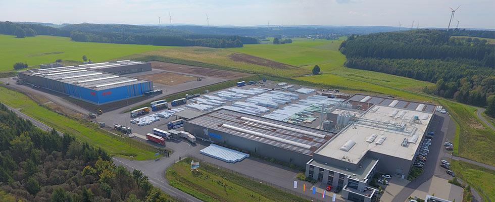Hof Factory uses Wind power with two wind turbines, 6000 m² of photovoltaic panels, heat pumps and exchangers.