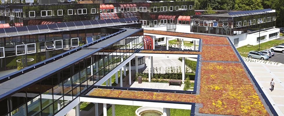 Visible green roof terraces (1,000m²): SOPREMA waterproofing system composed by four products: