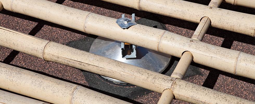 Commonly used to integrating photovoltaic systems on roof, they are serving here to anchoring dry bamboo sticks. They siting on top of a SOPREMA two-layer waterproofing complex of more than 4,000 m² composed of the Soprastick® SI and Sopralene® Flam 180 AR membranes.