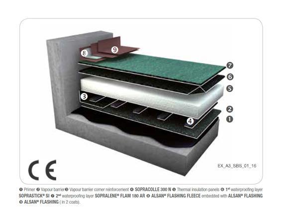- Upstand variant: Alsan® FLASHING (European Technical Approval ETA-08/0114) will avoid the use of counter flashing protection on parapets. This no-flame system is easy to apply and saves application time.
