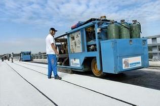 ANTIROCK® PR is used for waterproofing underground structures. It is bonded onto the upper surface of the structure (a cut and cover tunnel for example) and is protected against puncturing by the backfill by a geotextile, a layer of concrete or asphalt. An anti-root treatment protects the membrane against attack from plants. This membrane has the same characteristics as ANTIROCK® PR, but also has excellent resistance to perforation by roots to meet the requirements of underground structures. The membrane is welded and smoothed onto a substrate prepared with primer: ELASTOCOL® 500 TP, GLACIVAP® (primer/pore filler) or AQUADERE® TP (solvent-free primer). The welding is performed: either manually with a flame, or automatically using hot air (MACADEN® system). The membrane is pre-heated before being applied and then the primed substrate and the bituminous sheet are heated alternately. A 90mm selvedge ensures easy overlapping.