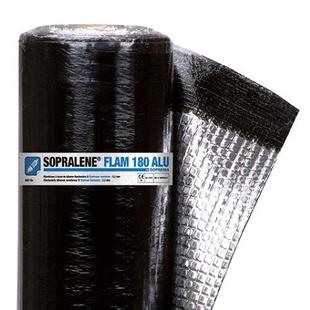 SOPRALENE FLAM® 180 ALU is a flexible SBS elastomeric bitumen waterproofing membrane with a non-woven polyester reinforcement. The topside is protected by an embossed aluminium foil and the underside by a thermofusible film.