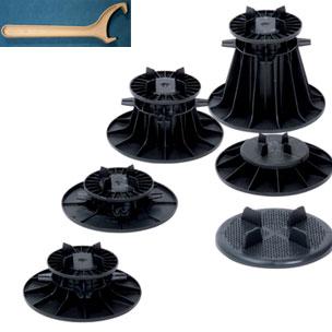 Adjustable paving slab support pads can bear several paving slabs, be used to level paving, by means of a fuss free, hand-operated specially designed spanner included in each box an easy installation. The adjustable paving slab support can be used to level out paving, by means of a fussfree, hand-operated specially designed spanner (included in each box). SOPREMA offer two types of paving pads: fixed or adjustable.